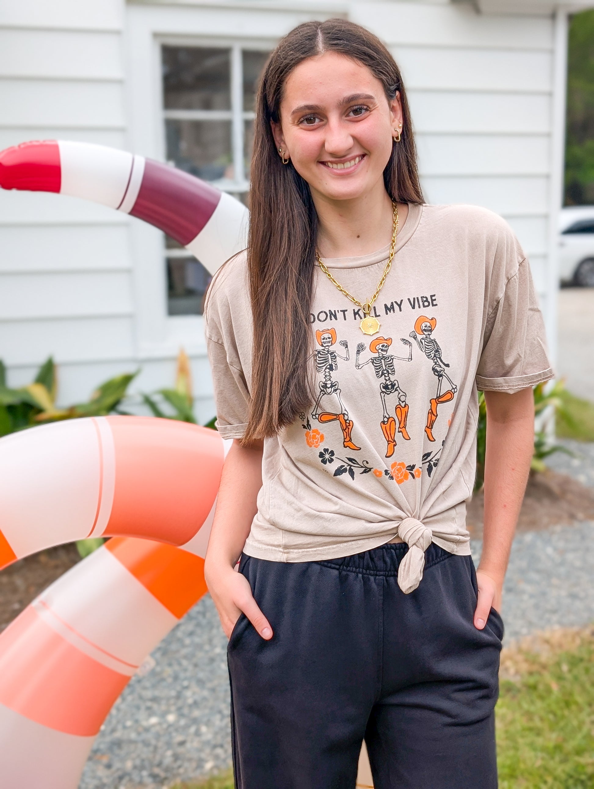 Get in the spooky spirit with our Don't Kill My Vibe Mineral Graphic Tee! This retro-inspired Halloween tee features a unique design and soft fabric for ultimate comfort. Perfect for adding some festive fun to your wardrobe. Don't miss out on this must-have item!