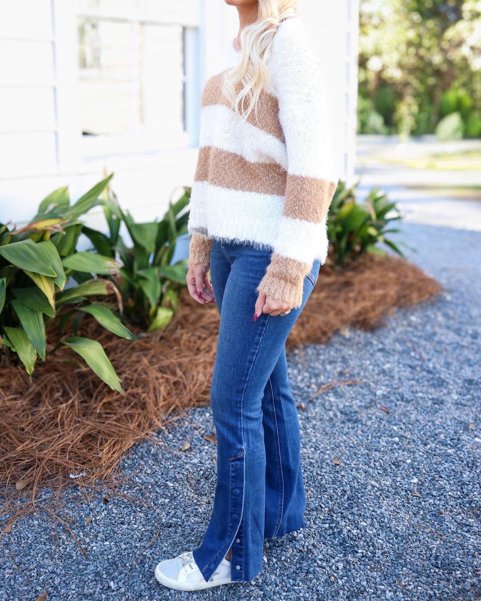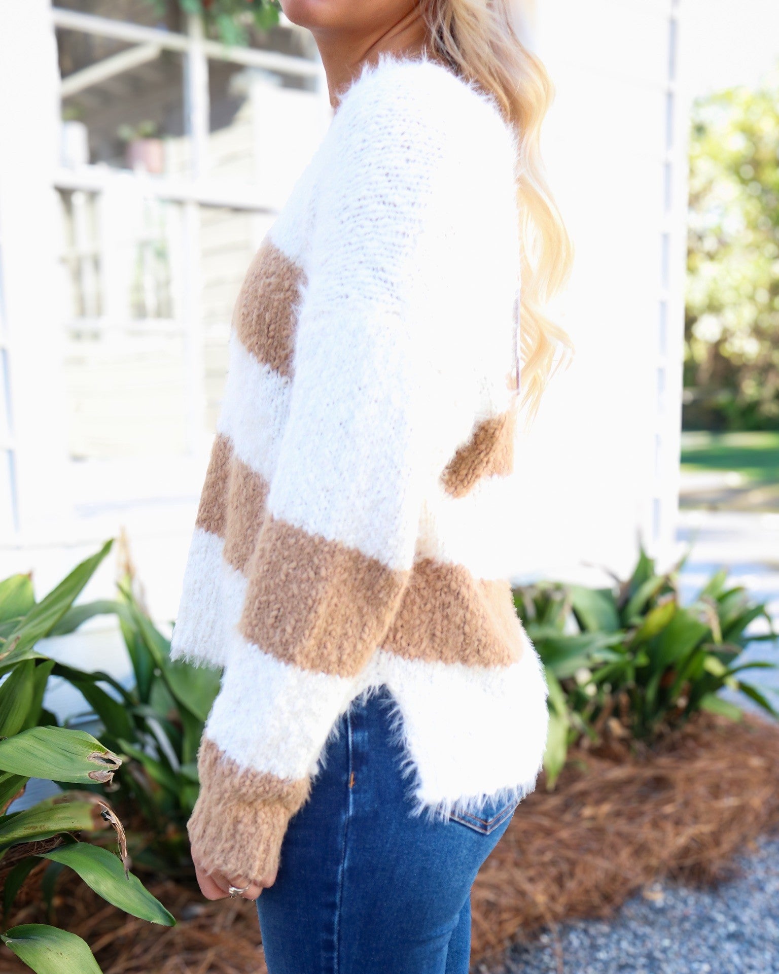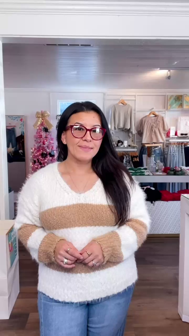 Emberly Fuzzy V Neck Stripe Sweater