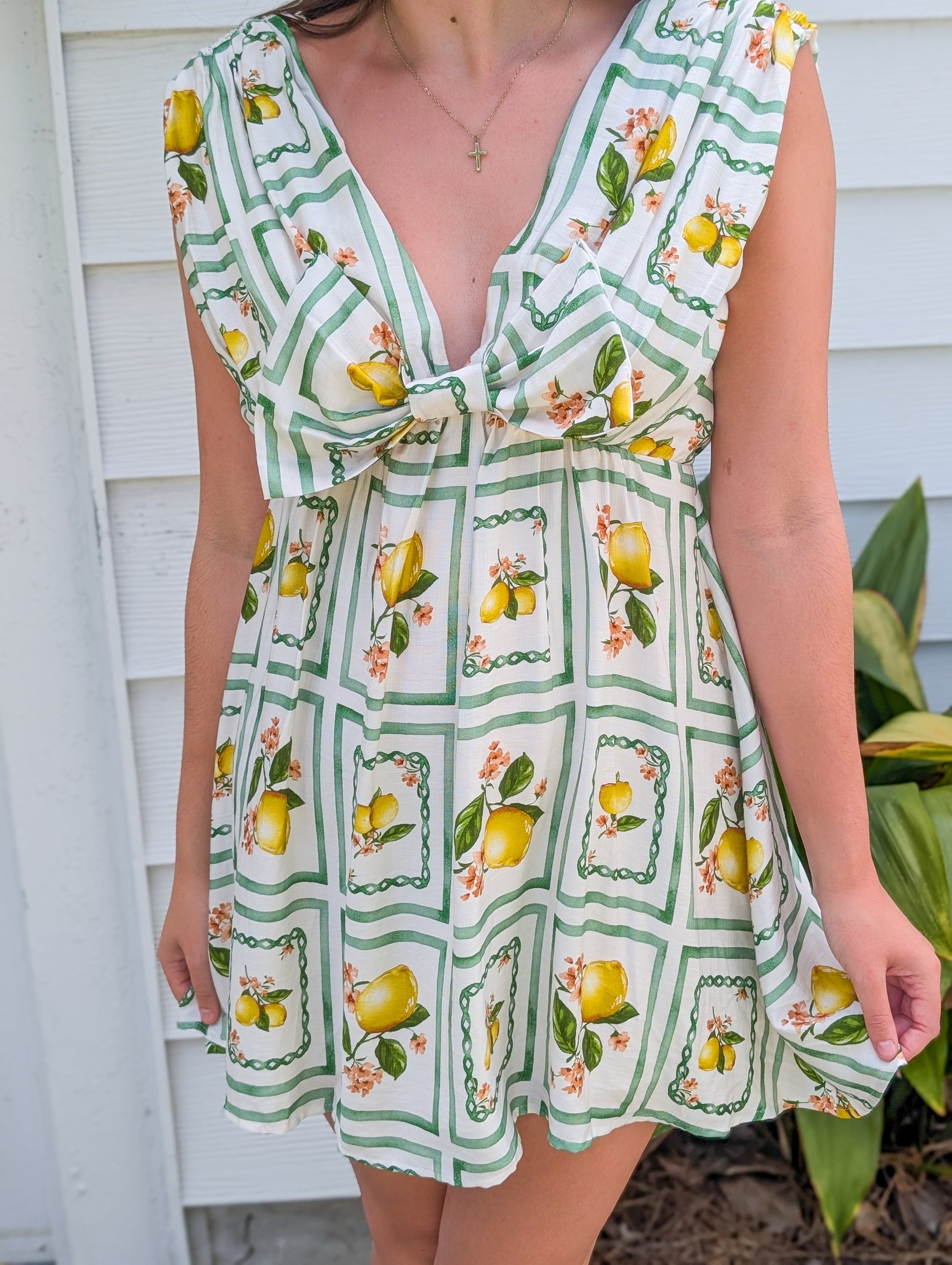 Brighten your wardrobe with the Lemon Delight Print Bow Short Sleeveless Dress, featuring a lively lemon pattern in sunny yellows and fresh greens. This playful pre-fall dress is perfect for weddings, showers, or girls' brunches, blending girly charm with an edgy twist. Designed to fit true to size, it offers a flattering silhouette that’s both fun and comfortable. Embrace a cheerful look that stands out with effortless style.