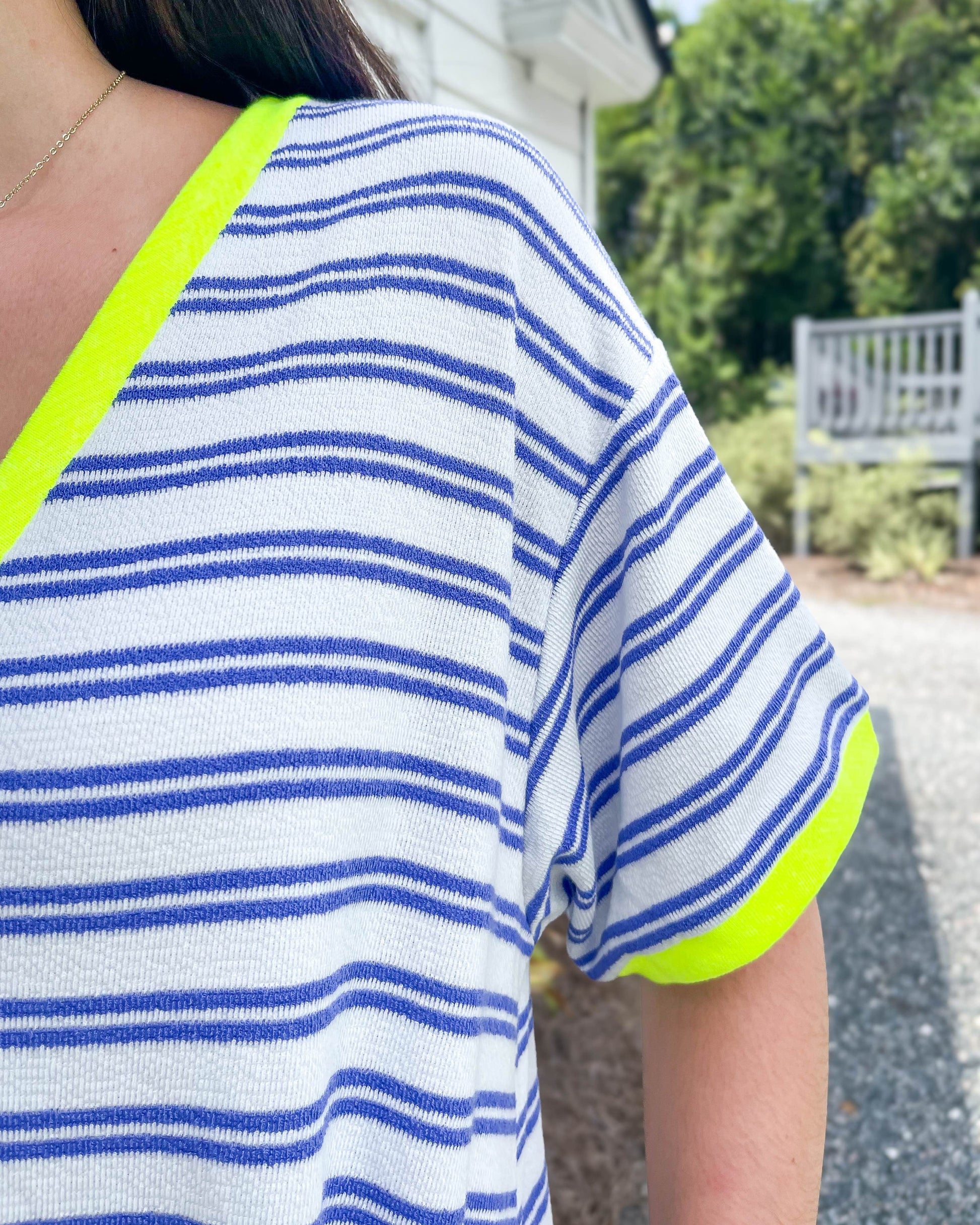 Elevate your style with our Striped Knit Binding V-Neck Romper. Featuring a deep v-neck, short sleeves, and drop shoulders, this romper is perfect for any occasion. The striped design adds a touch of sophistication while the cuffs and hem provide a flattering fit. Make a statement with this must-have piece!