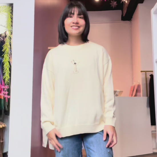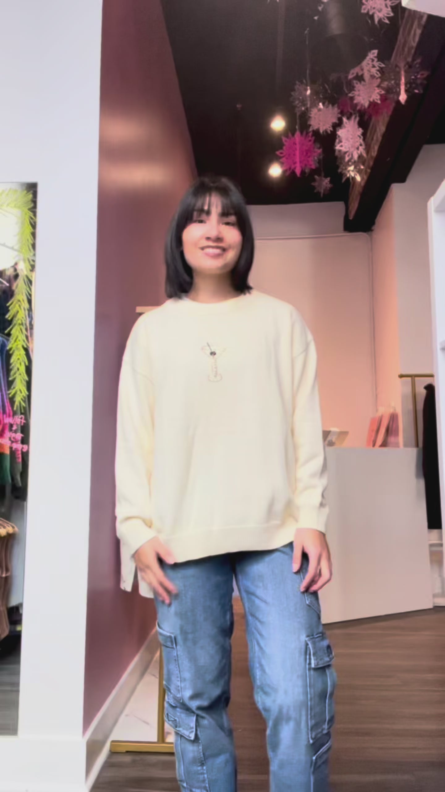 Keywords: martini bead sweater, knit statement sweater, oversized women's sweater, playful embroidery top, trendy women's fashion, cozy knitwear, long sleeve sweater, wholesale women's clothing, whimsical sweater