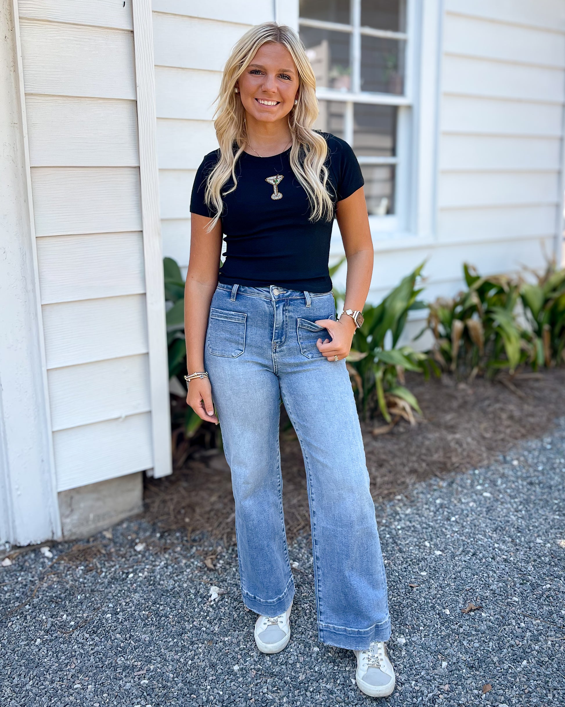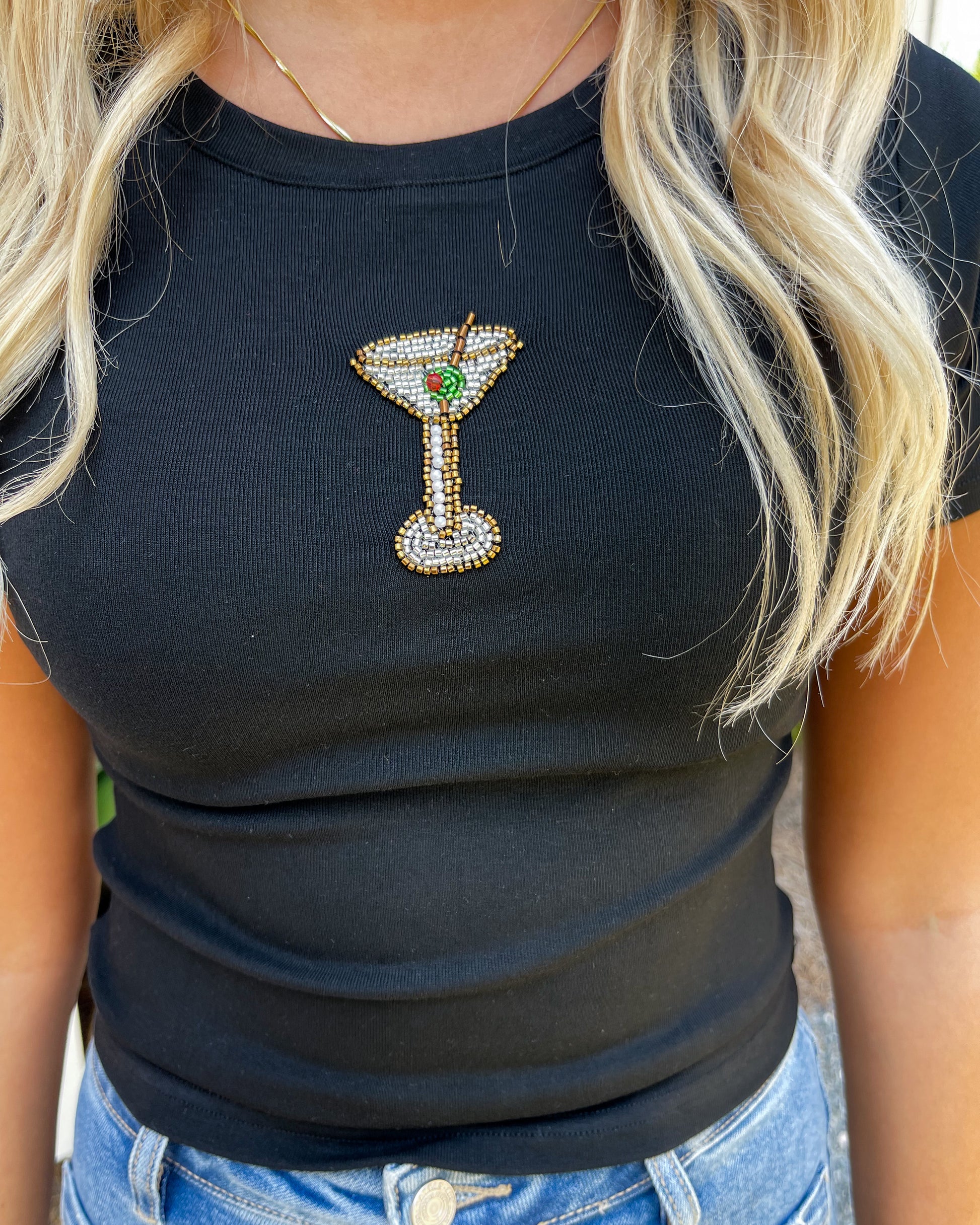 Add a touch of fun and flair to your casual lineup with the Gemma Martini Bead Tee! This playful tee is adorned with sparkling martini bead embroidery, serving up a quirky statement twist for any outfit. Crafted from a soft and stretchy blend, it's designed for all-day comfort and effortless style-perfect for everything from brunch dates to girls' nights out. Martini bead embroidery for a unique, eye-catching accent. Short sleeve design for easy, breezy wear. Soft, stretchy fabric blend for maximum comfort and a flattering fit